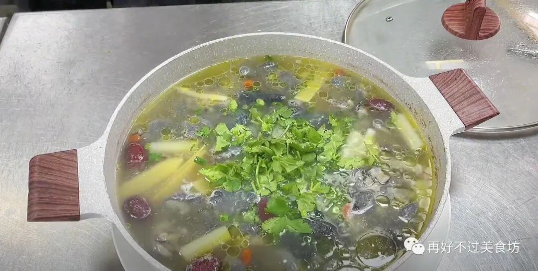 14、然后再盖上锅盖炖制10分钟,时间一到,打开锅盖,锅里的鸡肉已经软烂入味,最后撒上一点葱花和香菜,一道咸鲜美味,营养丰富的山药炖乌鸡就做好了,建议有时间的朋友,为自己和家人炖上一锅这样的汤。