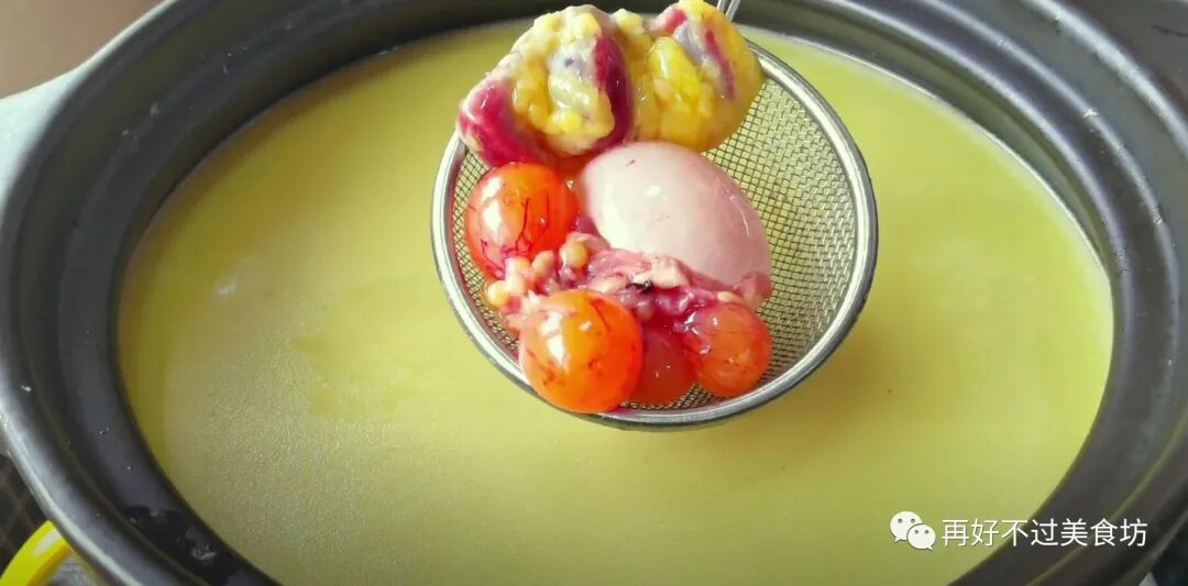 11、开大火煮开,煮至汤汁变白,再把鸡块连汤汁一起倒入砂锅里,把鸡蛋、鸡胗也加进来,继续开大火煮30分钟,再转小火炖一个半小时。