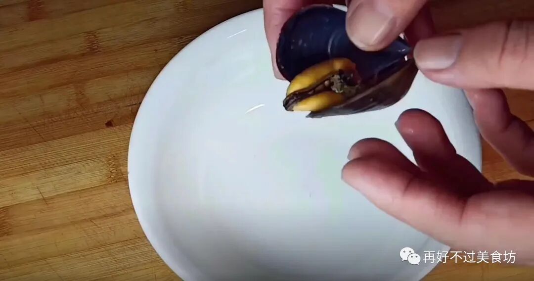 3、下一步把海虹壳剥开,把肉取出,中间这个部位不能吃,一定要去掉,有的海虹还有很多淤泥,一定要清洗一下。
