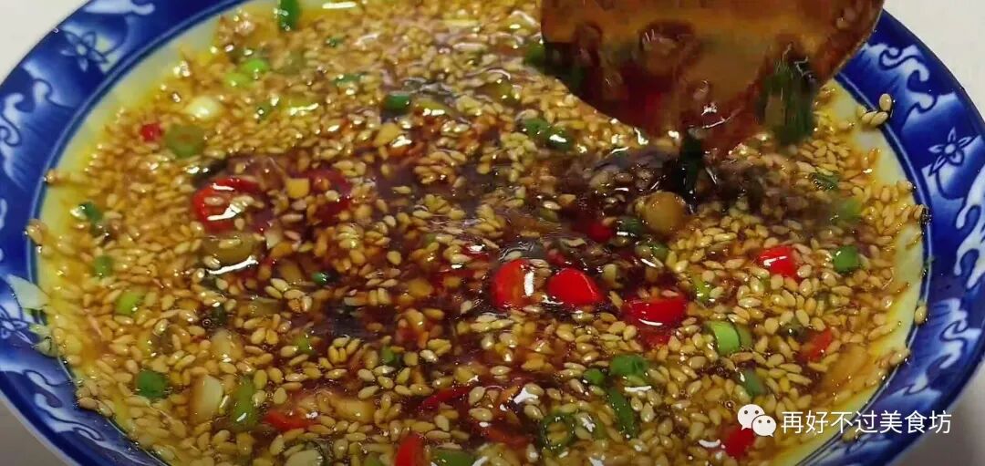 4、趁着这个时间,我们来准备蘸料,小碗中加入葱花、小米辣、蒜末、熟的白芝麻,泼入热油,激发出香味,加入少许食盐,一小勺白糖,加入适量的生抽,适量的陈醋,用勺子给它充分搅拌均匀,先放一边备用。