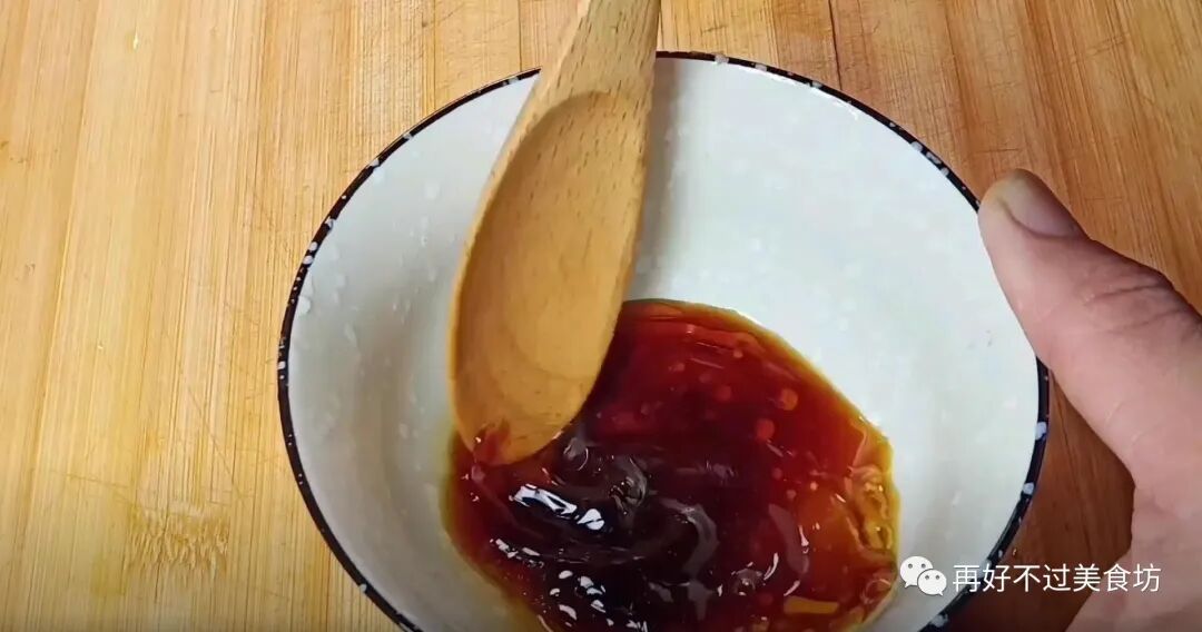6、再调一个拌海虹的料汁,碗中加入少许食盐和味精,半勺生抽,少许香醋,再加一点香油,最后放一点芥末油,用不喜欢吃的朋友可以不放,用勺子给它拌均匀。
