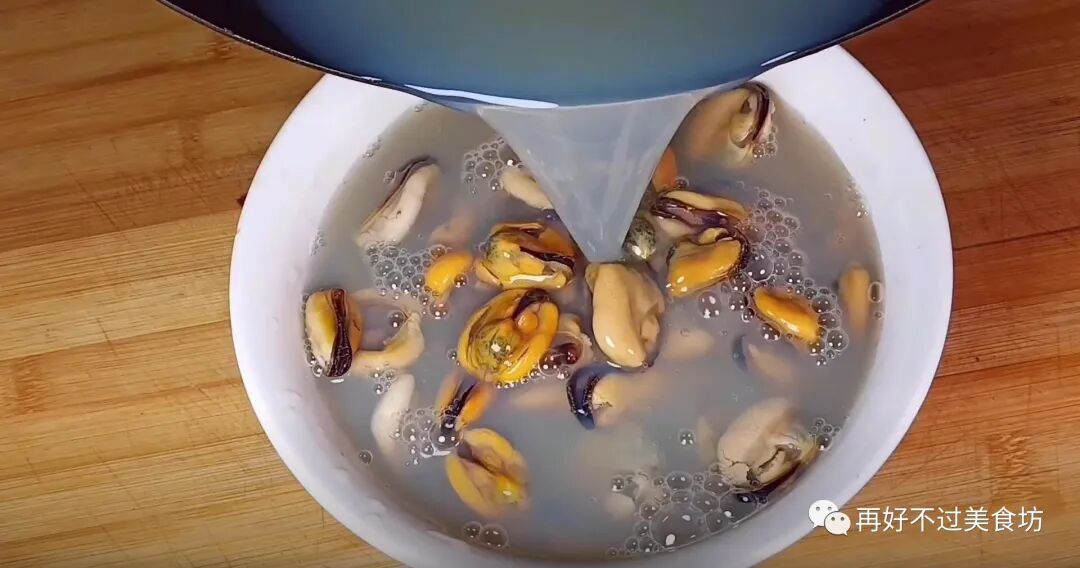 4、清洗海虹的时候,不要用清水,而是要用煮海虹的汤汁,这样洗出来的海虹,不会失去它本身的鲜味,清洗干净后,把海虹控水捞出备用。