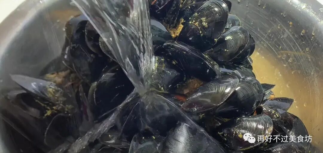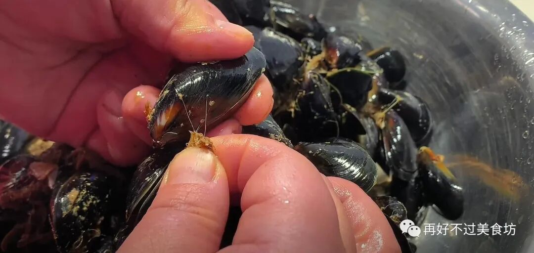 3、轻轻把海虹上的足丝给它拉出来,然后把海虹一个一个的摘除下来,全部摘好以后,再次加入清水,表面会有很多足丝和泥沙,清理起来比较麻烦,可以用刷子和钢丝球给它轻轻刷洗干净,清理干净后就放一旁备用。