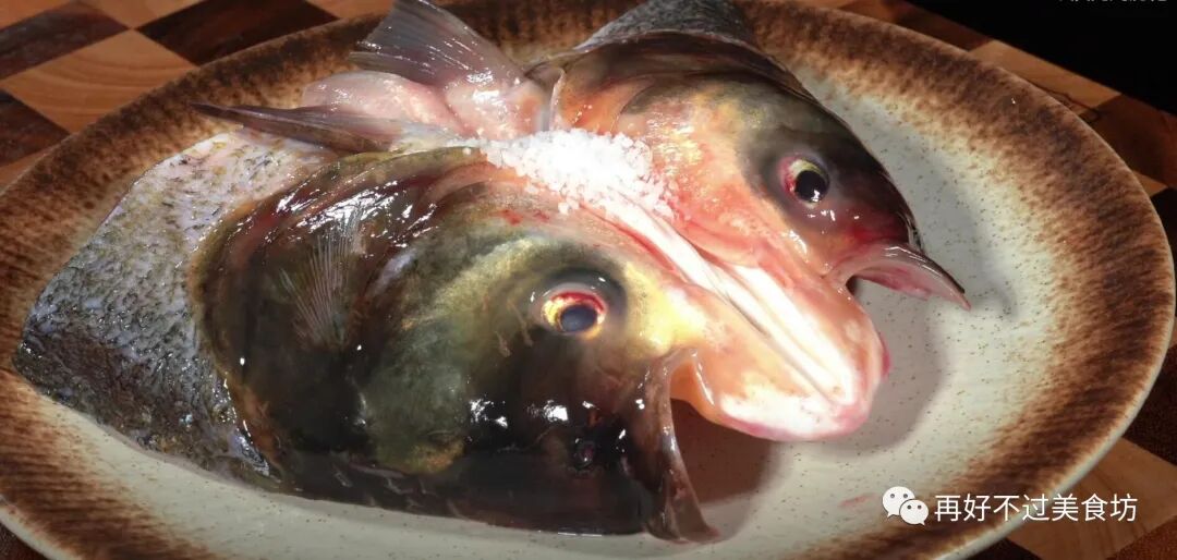 2、准备一个大头鱼头,在鱼肉上撒一点食盐,给它涂抹均匀,这样等下煎的时候,就不怕它粘锅了,汤也会香一点。