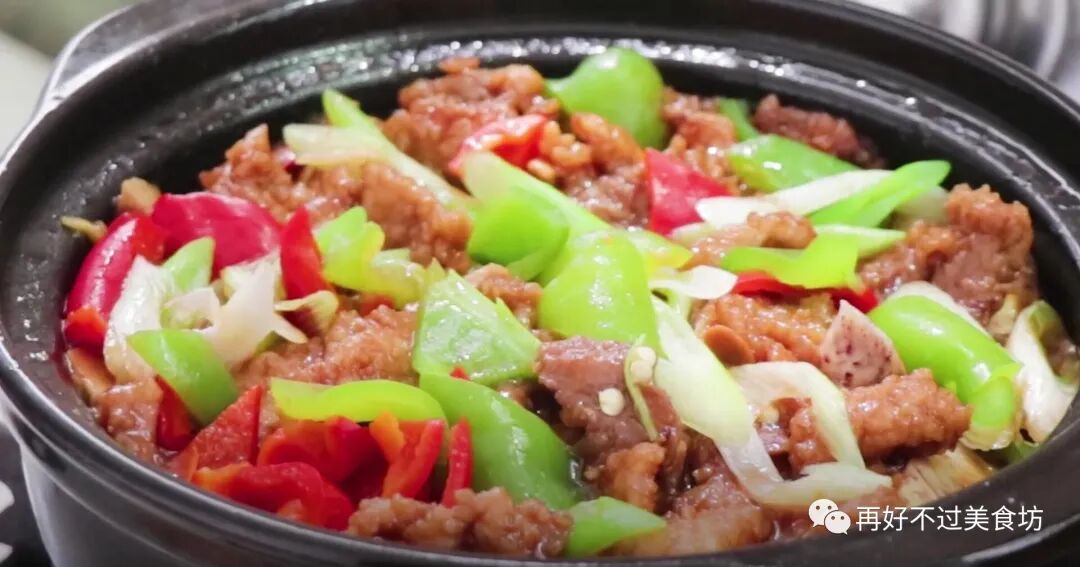 10、时间一到,将切好的青红椒倒入砂锅中,然后再来几片大葱,盖上盖子焖一会,就这样,一道非常下饭的芋头豆腐煲就做好了,喜欢的朋友赶紧试试吧。