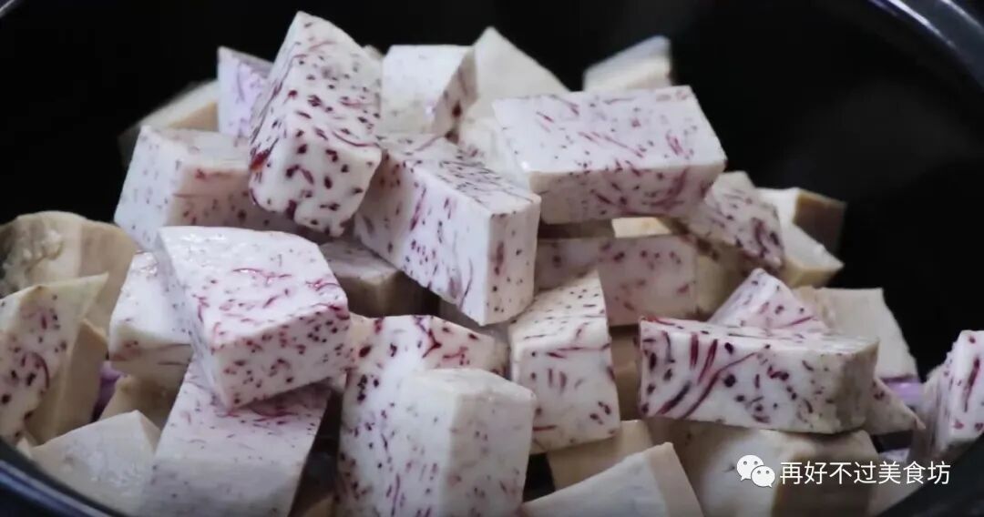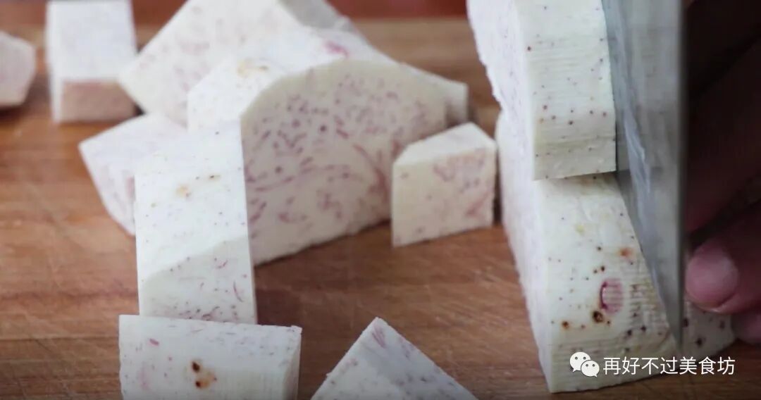 3、准备半块芋头,用刀给它切成小方块,这样方便等下制作,切好之后,给它放一旁备用。