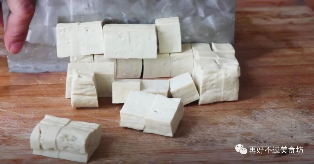4、再拿出一块豆腐,也改刀切成大小均匀的方块状,切好也放盘子里备用。