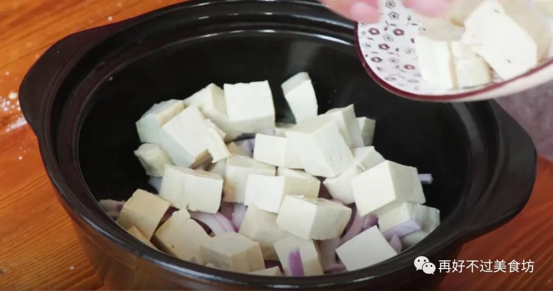 6、准备一个砂锅,锅底放少许油,接下来放入蒜末跟洋葱,再把切好的豆腐放进去。