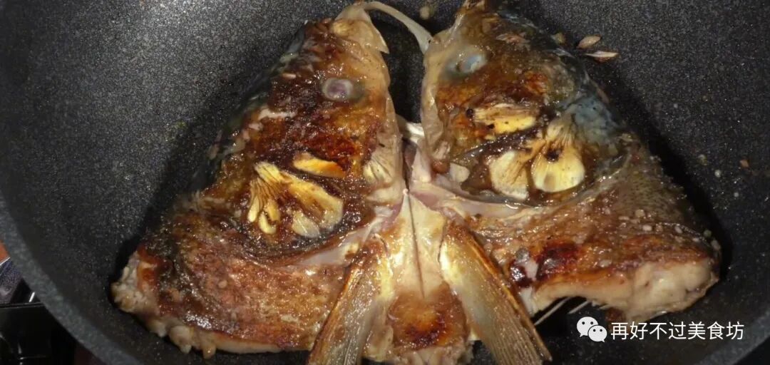 3、起锅,倒入一点食用油,然后把鱼头给整个放下去,这里注意要用大火煎,无论是煎鱼还是煎鱼头,一定要用大火,直到煎到两面金黄,煎香鱼头也是鱼头汤奶白的原因。
