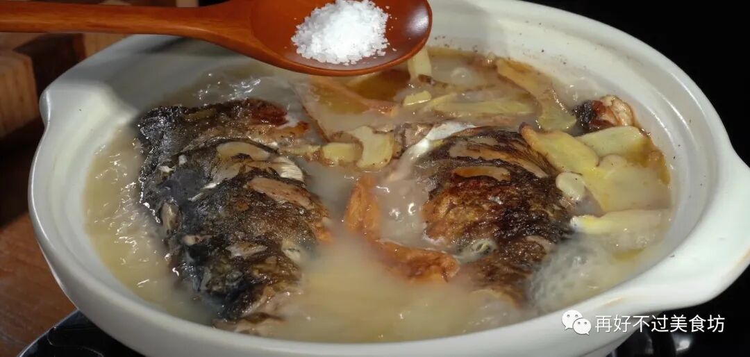 6、时间一到,试过味道要是觉得不够咸的,可以加入半勺盐进去,给它调一下味道,就这样,一道奶白不腥,香浓好喝,入口鲜美的天麻鱼头汤就做好了。