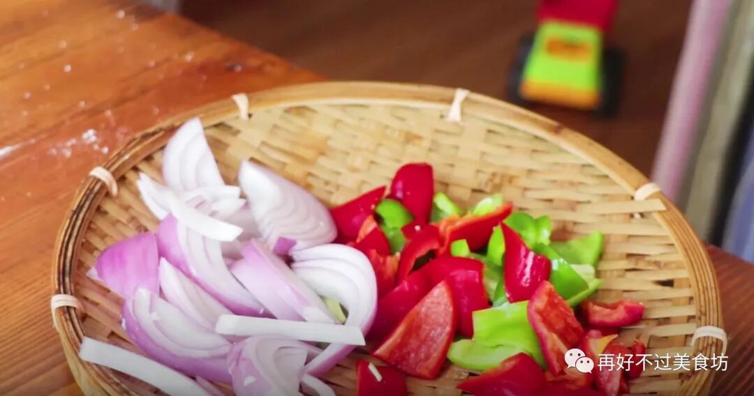 5、下面来半个洋葱,适量青红椒,给它改刀切好备用。