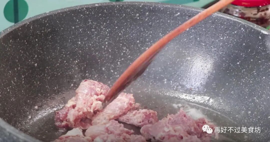 8、锅底留适量油,将准备好的瘦肉倒进去炒散,接下来给它调一下味,加入少许生抽,再来一点老抽上色,一勺黄豆酱,将它们翻炒一下,再放入一碗清水。