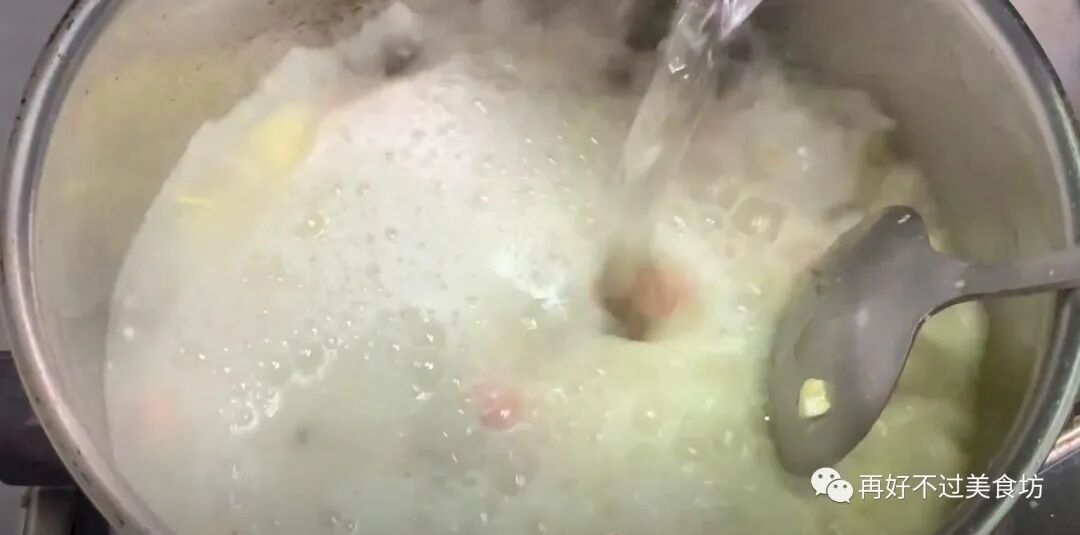 5、等它们都煎出香味之后,就倒入适量的开水,汤一下子就变得很白了,如果味道够的话,就不用再放盐了,大家如果不知道咸淡,可以尝一下,然后再根据口味调整。