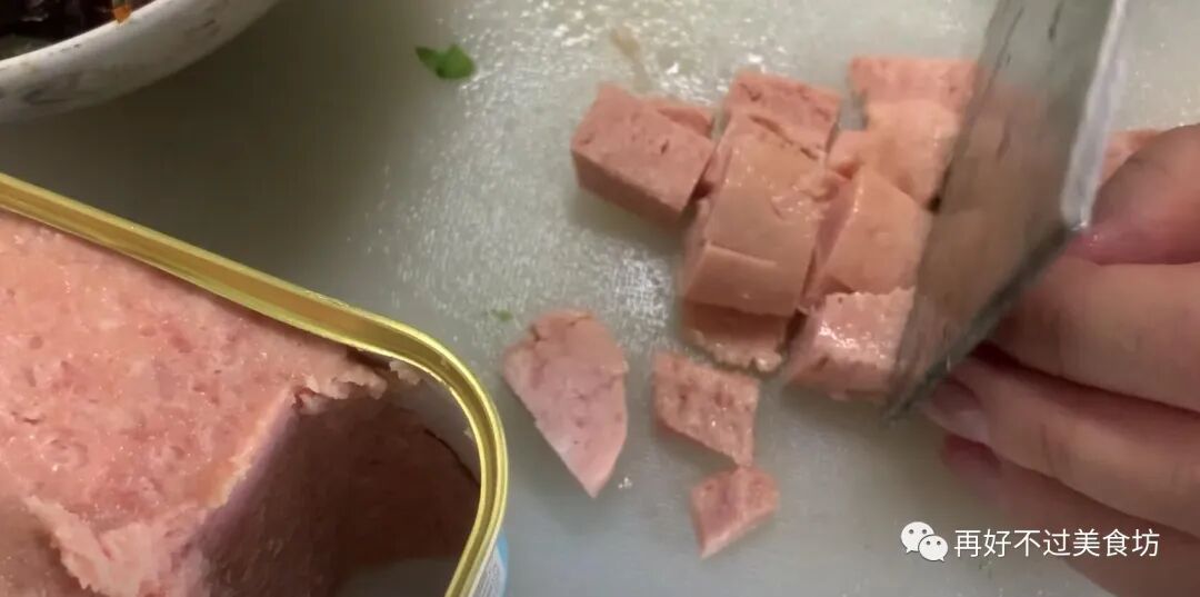 2、下一步打开一罐午餐肉,用勺子把午餐肉挖出来,然后用刀切成小块,还有一点大家要注意,午餐肉的嘌呤含量很高,应该适量进食,而痛风患者应避免进食。