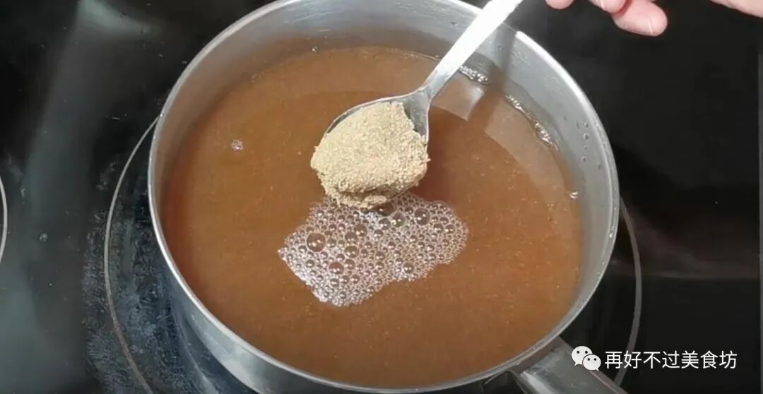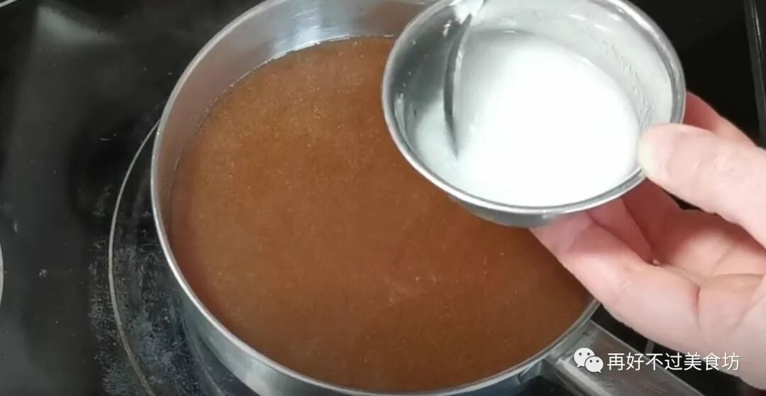 7、准备30克白凉粉,加入一点水给它搅拌均匀,然后一边搅拌一边把白凉粉倒进去,直到完全搅拌均匀。