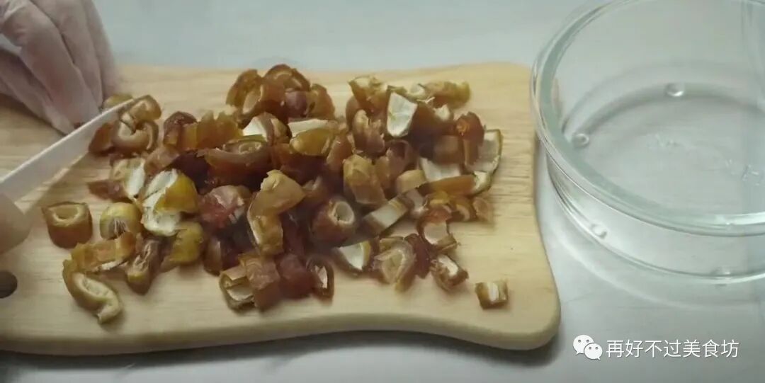 3、把所有的椰枣都去了核之后,再把椰枣切成小块,椰枣有点硬,也很粘,切的时候一定要小心手。