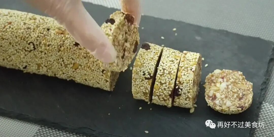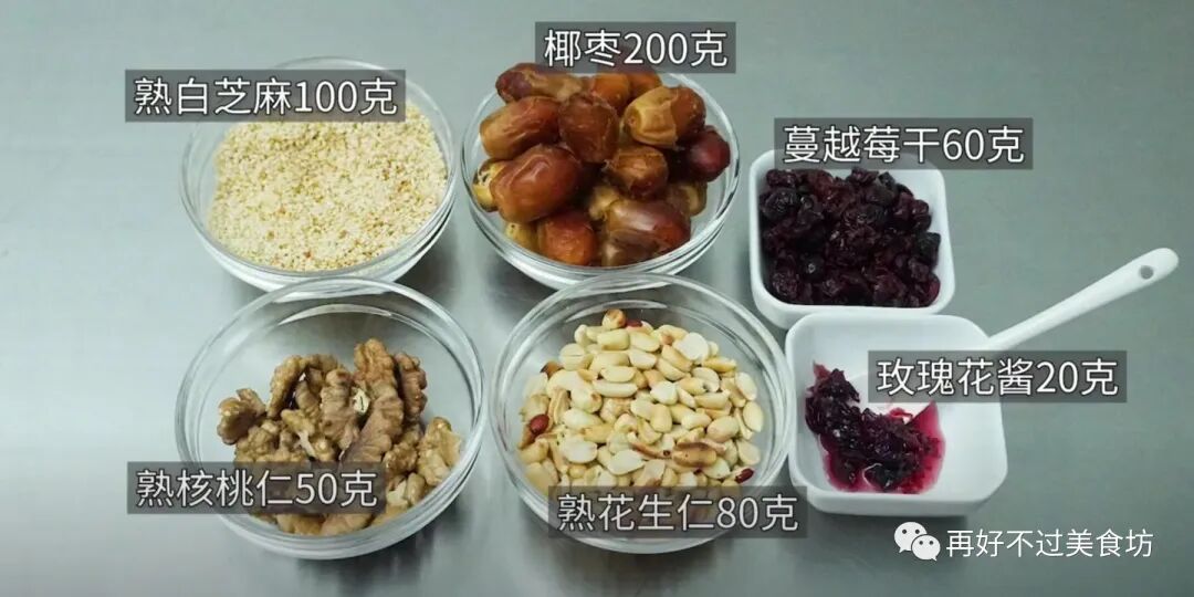 主要食材:熟白芝麻100g、椰枣200g、蔓越莓干60g、玫瑰花酱20g、熟核桃仁50g、熟花生仁80g