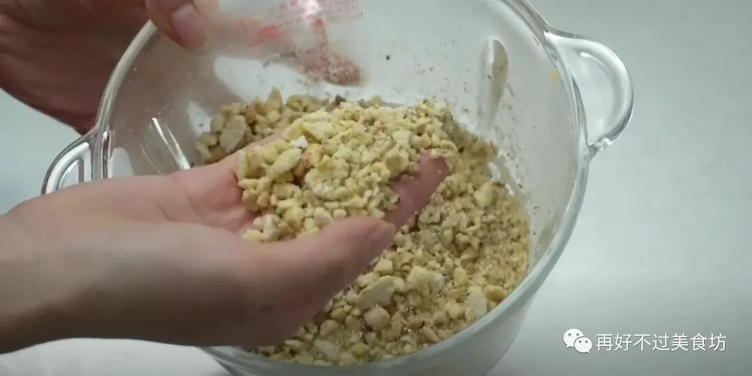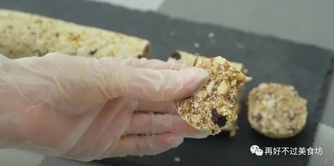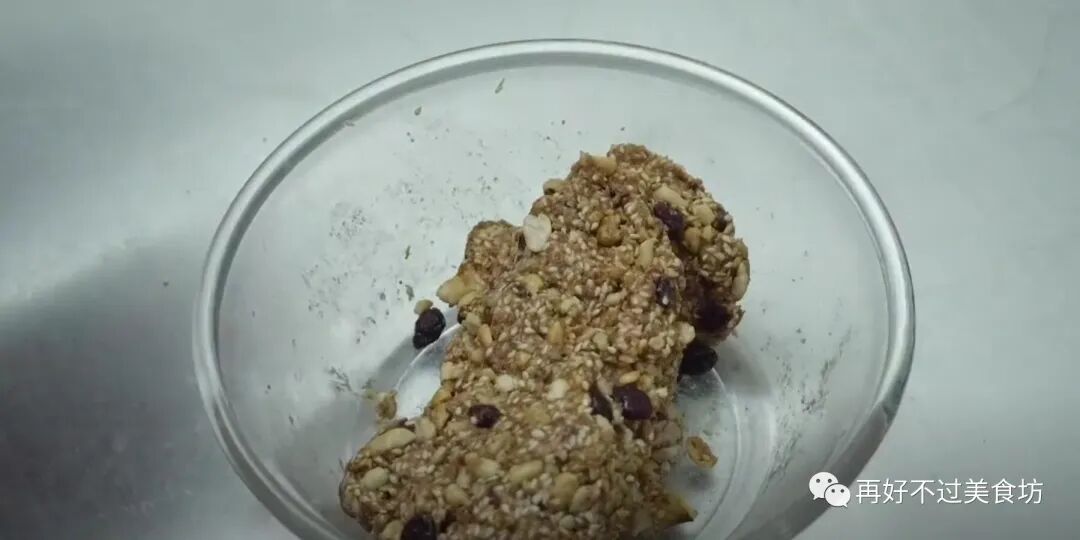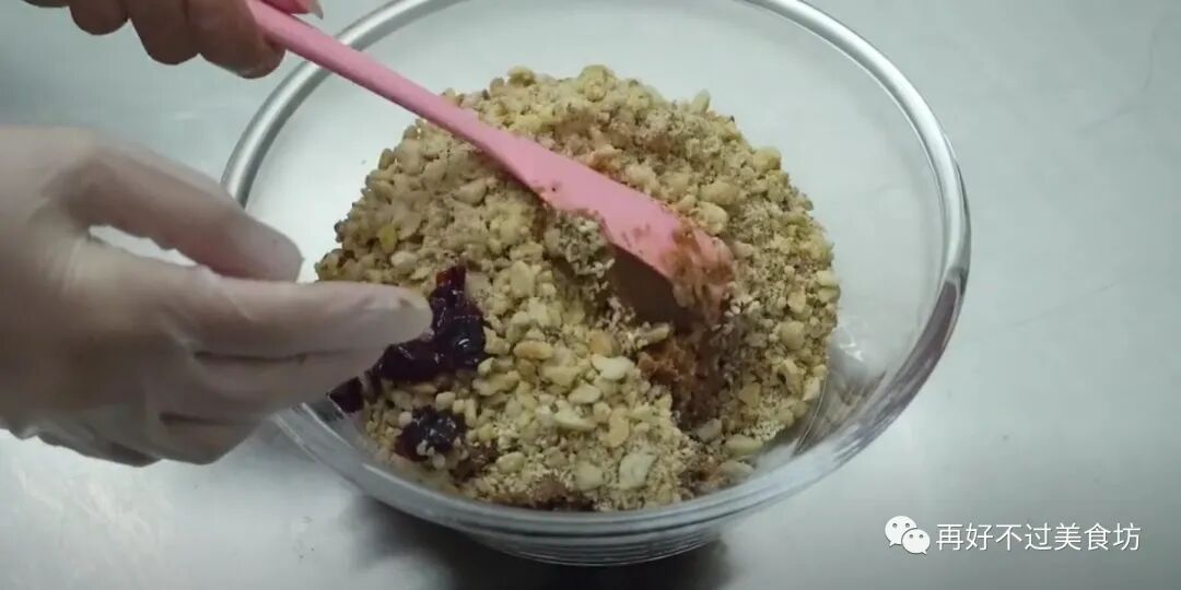 7、下一秒戴上手套,把所有材料全部揉抓均匀,粘成一团的样子,里面的坚果仁可以换成自己喜欢的坚果,比如南瓜籽,松子都可以。