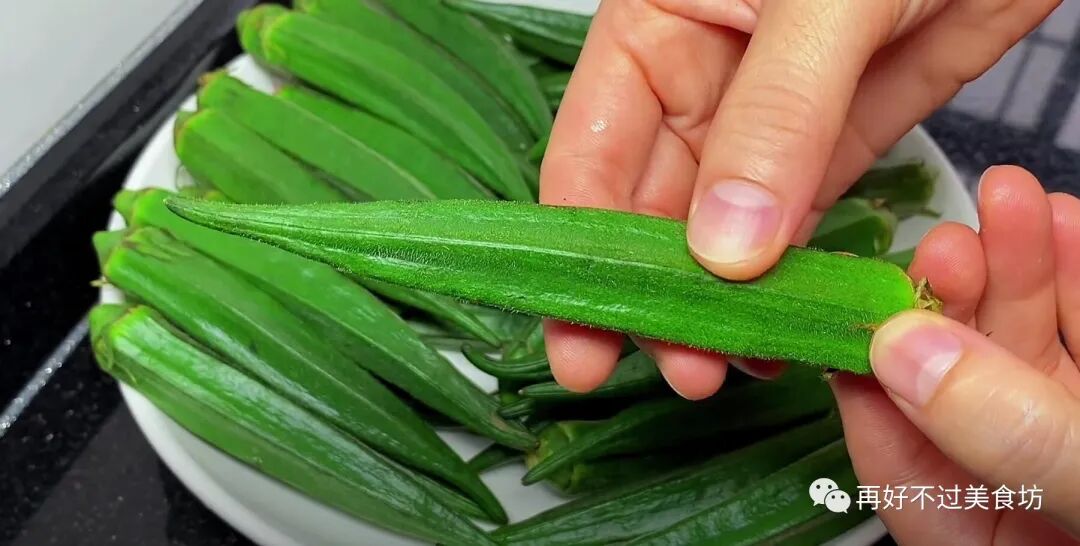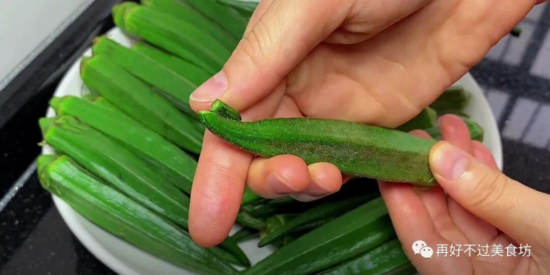 2、我一般选秋葵,都会按压一下,因为皮比较软,再用手轻松按压尾部直接断开,这样的秋葵比较嫩。