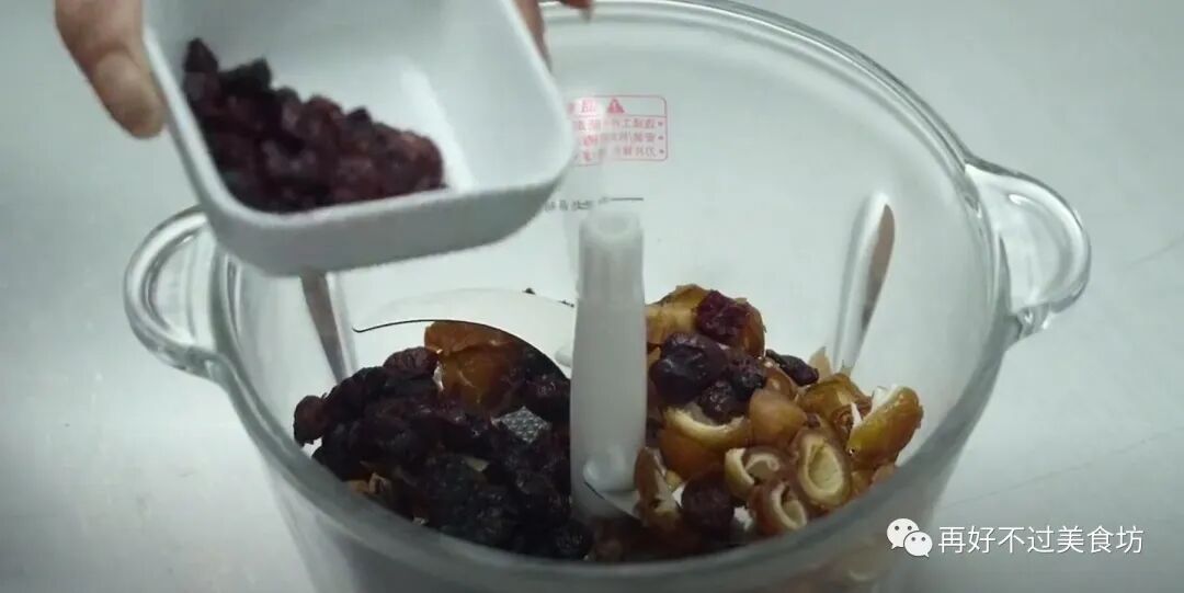 4、等椰枣完全切好之后,把切好的椰枣放入搅拌机中,再加入蔓越莓干,但蔓越莓干不用放完,留一点点出来备用,之后盖上盖子,把椰枣打成椰枣泥的状态,就可以了。