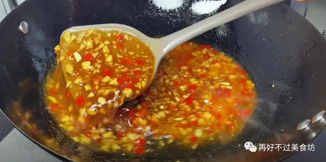 11、锅烧热,倒少许食用油,等油热之后,先倒入一半的蒜末进去,开小火把蒜末炸至金黄色,再把剩下的蒜末也倒进来,继续炒香后,再倒入红椒丁和调好的酱汁,给它煮开,直到煮成粘稠状。