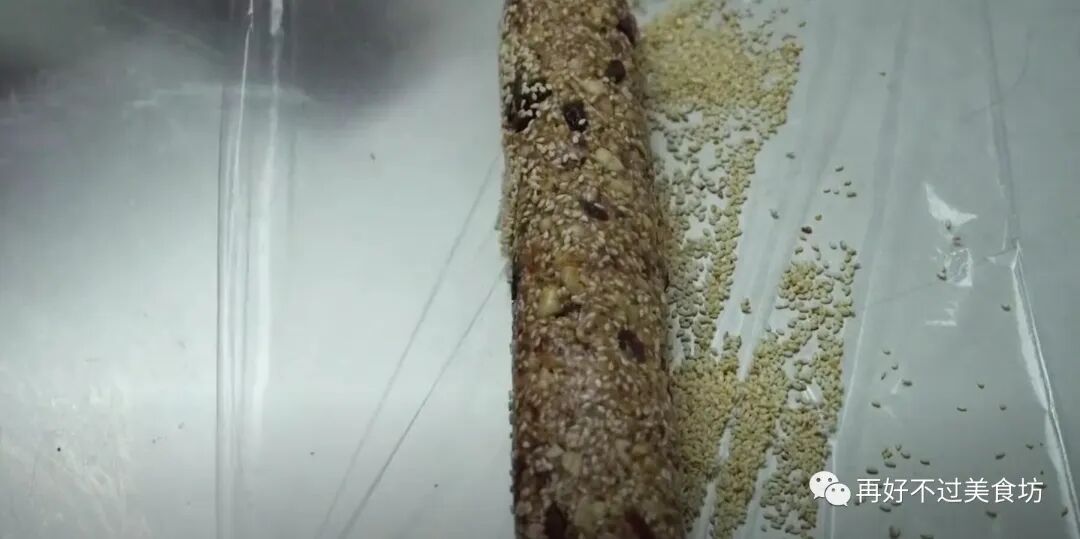 9、等团成长条之后,再铺一张保鲜膜,然后在桌子上,撒入刚刚剩下的白芝麻,再把椰枣糖放在上面,利用保鲜膜把白芝麻,全部压在椰枣团上,团起来后再卷起来使劲地搓它,直到白芝麻全部都粘在上面。