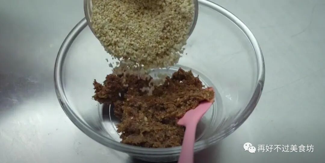 5、接着把椰枣泥盛出来放在大碗中,因为打好的椰枣泥有点干,所以需要一点耐心,等椰枣泥完全放入碗中之后,再把炒熟的白芝麻仁倒入碗中,也留一点点出来,待会备用。