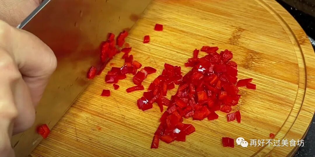 9、准备一个红椒,喜欢吃辣的,可以放小米辣,洗净后切成丁,装入碗中备用。