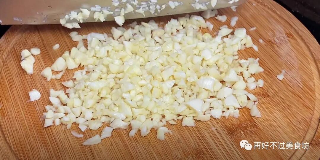 8、大蒜准备多一点,把它拍碎,再改刀剁成末,装入盘中备用。