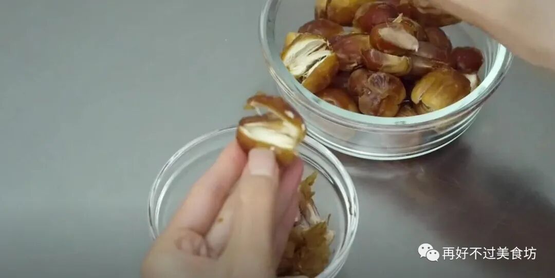 2、接下来我们处理椰枣,椰枣去壳,用小刀在枣中间开个口,再把枣核拿出来,椰枣盛产于伊朗和新疆一带,与红枣相比肉质厚实,口感甜糯,如果没有椰枣的话,也可以用杏脯干或果干来代替。