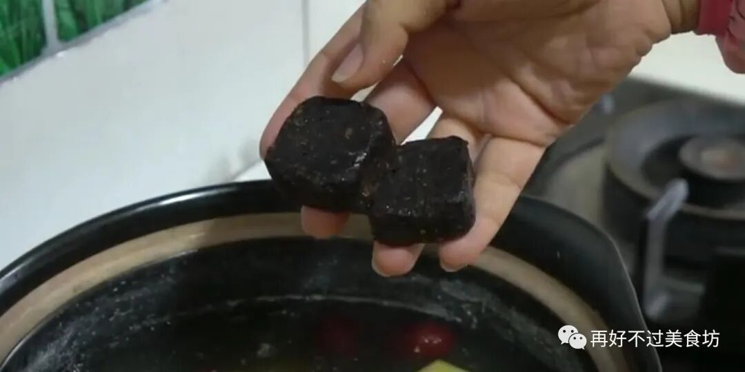 4、时间到了以后,把南瓜放进去,再加入40克老红糖,家里如果没有老红糖,也可以用普通的红糖或者冰糖代替,继续小火给它煲15分钟。
