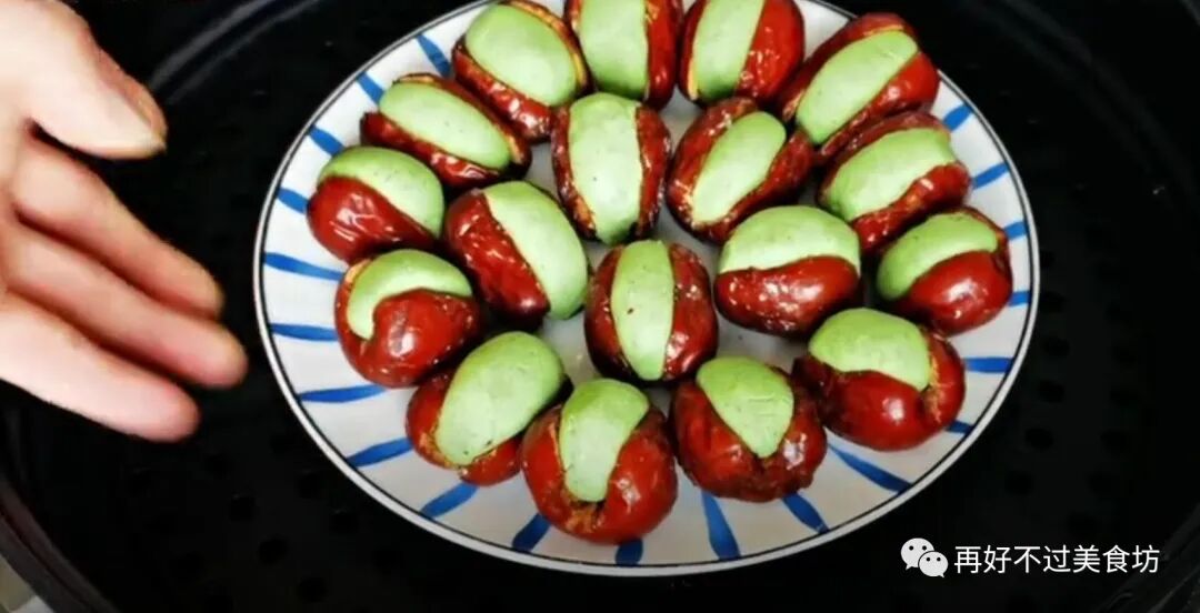6、取一小团糯米团,在手掌心揉成椭圆形,把糯米团放到红枣里整理一下,按压紧实红枣的部位朝下,让糯米团的方向向上,依次摆放在盘子里,全部做好以后,连同盘子一起放到蒸锅里,盖上盖子,上汽后中火蒸十分钟左右。