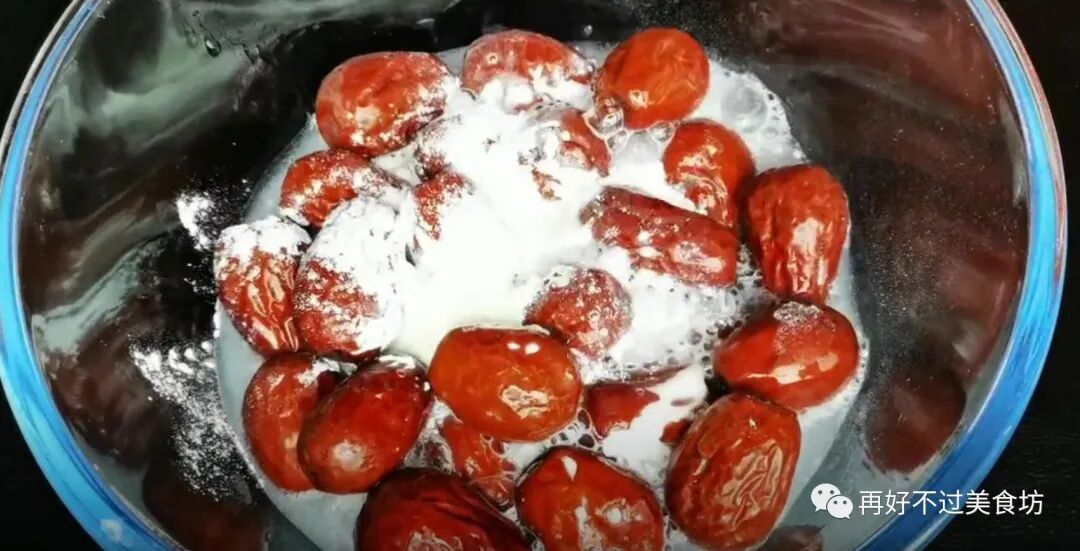 4、把红枣放进大碗里,加一勺面粉,加点清水,用手揉一下,面粉具有很强的吸附性,这样可以把红枣表面褶皱里面的灰尘清洗干净,俗话说一日食三枣,容颜不易老,平时多吃一些红枣,对我们的身体好处多多,泡好的红枣用清水冲洗干净。