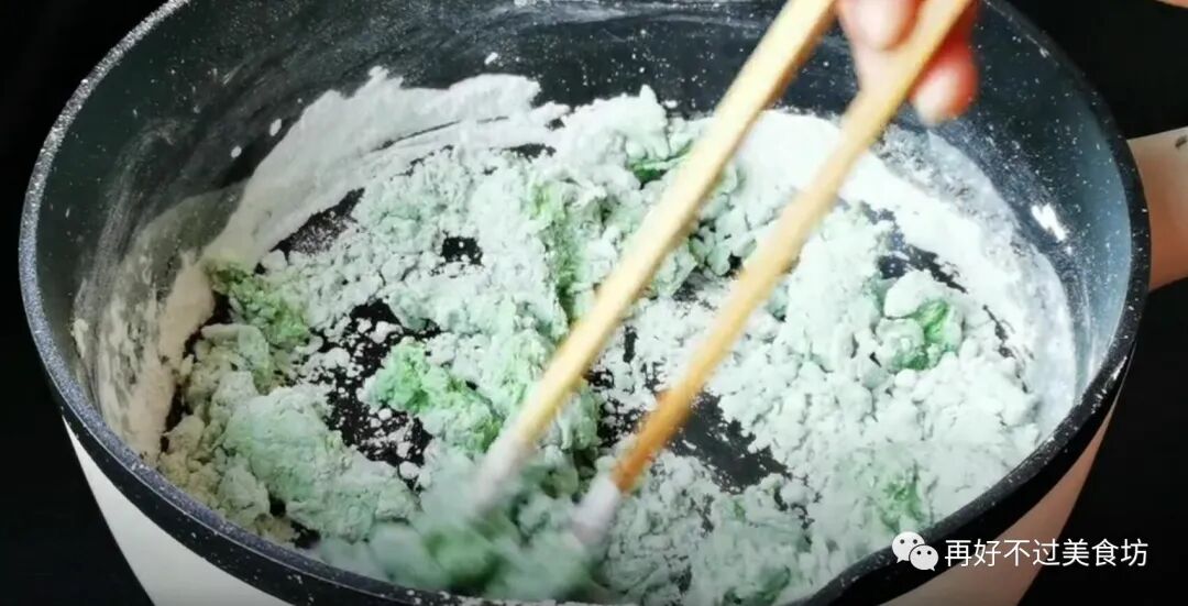 2、把菠菜汁倒入锅里,放入一勺白糖,烧开以后,再倒入半碗糯米粉,糯米粉的量,要少量分次的加入,用筷子搅拌成面絮。