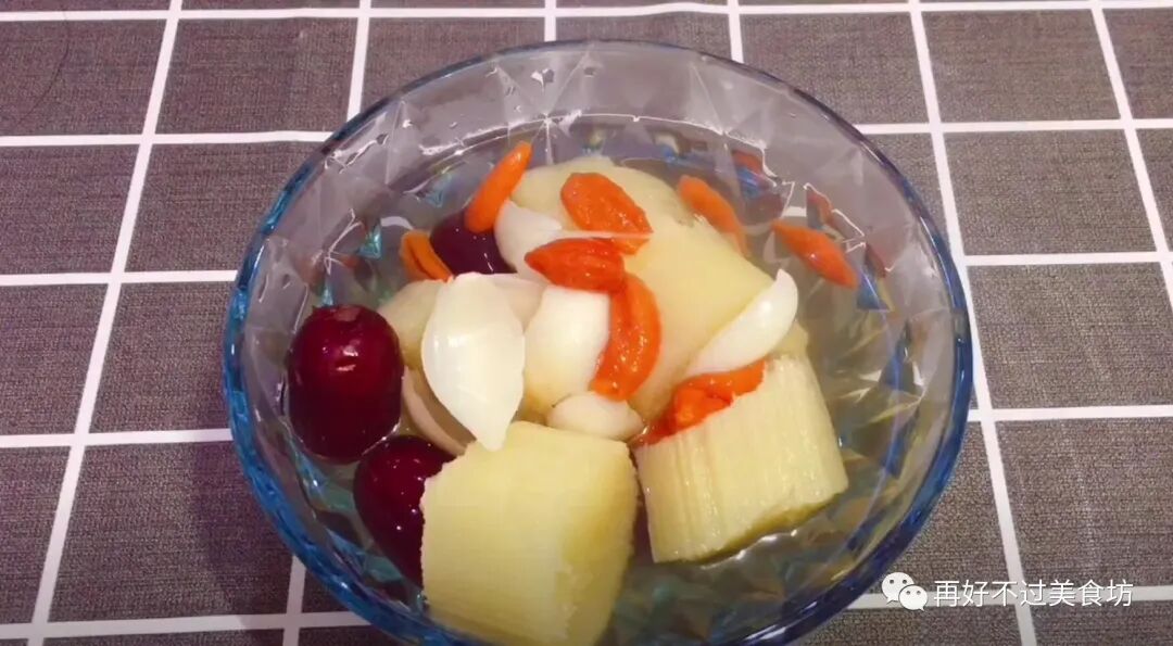 5、半个小时后,再根据自己的口味添加适量冰糖,加入适量枸杞,再煮五分钟,一道清甜又滋补的甘蔗糖水就做好了,感兴趣的朋友,赶紧收藏起来试试吧。
