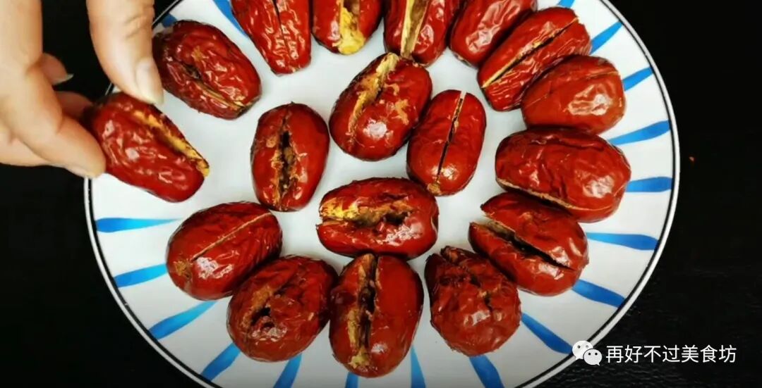 5、下面拿一个吸管,从红枣中间的位置直接穿进去,这样就可以把枣核完整的弄出来,而且红枣完好不变形,拿一把剪刀,从中间剪开,全部剪好以后摆放在盘子里。