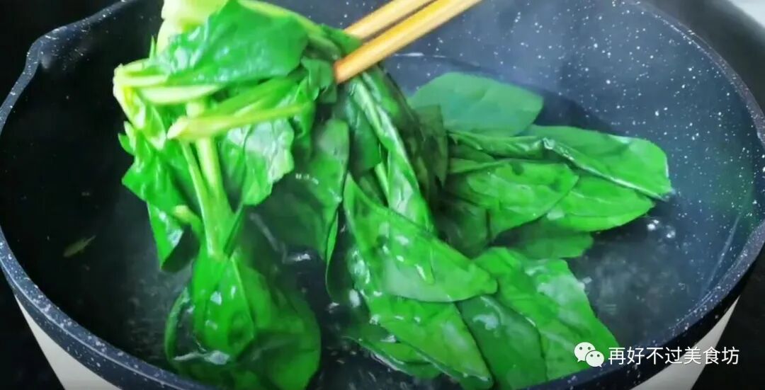 1、锅里烧水,放入食盐,烧开以后放入菠菜,焯水一分钟,捞出来放进料理机里,加入20毫升左右的清水,给它打成菠菜汁。