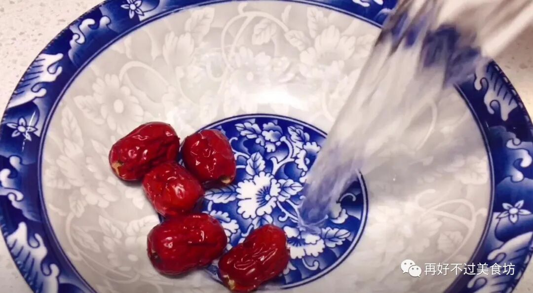 3、下面再准备适量的红枣,红枣本身的作用是健脾合营,还具有安神、安眠、补气血的作用,用清水给它清洗干净,洗干净之后,就也放一旁备用。
