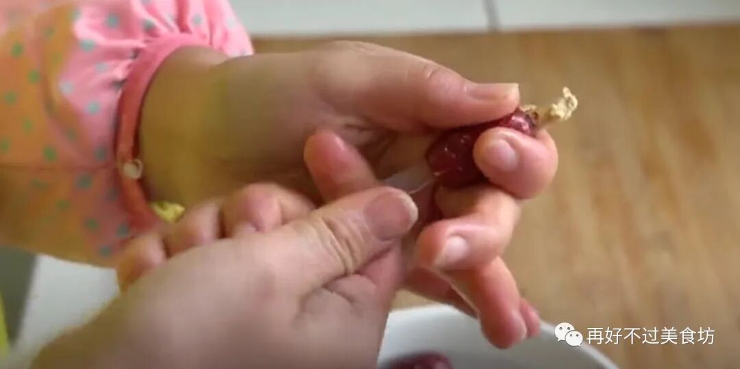 2、准备适量的红枣,先把它清洗干净,然后取出一根吸管,直接往红枣中间一戳,轻松就能将枣核去掉了,处理好后,也放一旁备用。