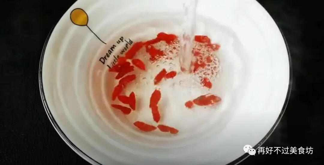 7、取出一把枸杞,放入一个小碗中,再用温水给它浸泡一下,枸杞在不同的季节功效也不同,在春季的时候,食用枸杞能够滋阴养目。