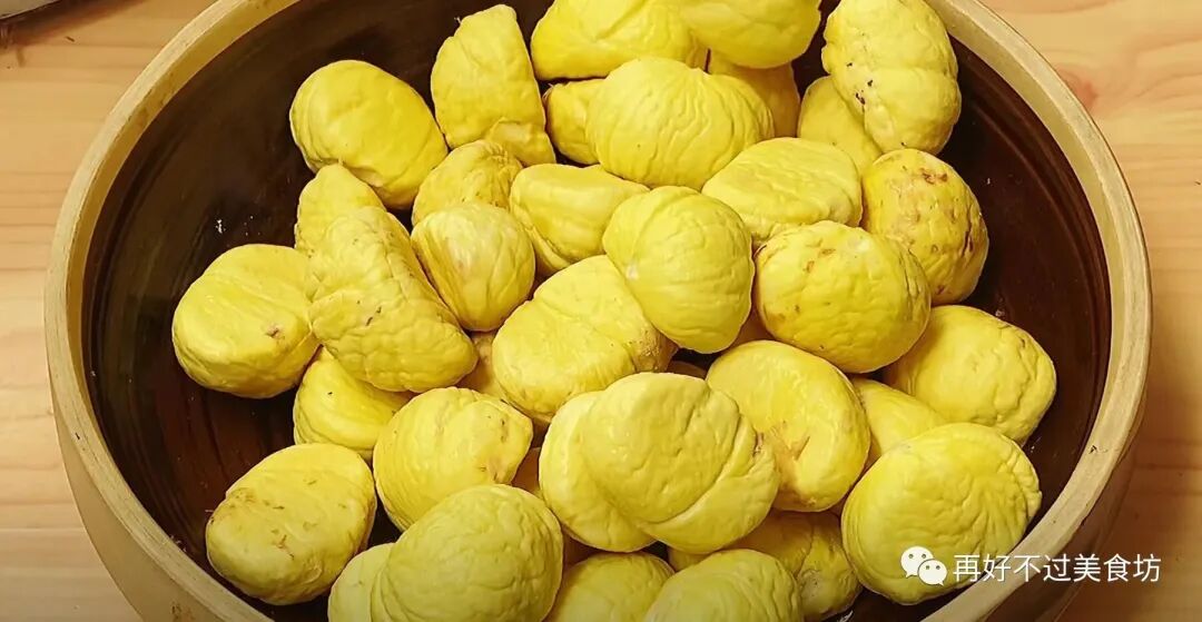 1、准备一些新鲜的板栗,板然后剥去外壳,如果嫌麻烦的话,可以直接买剥好壳的,全部剥好后,放入大碗中备用。