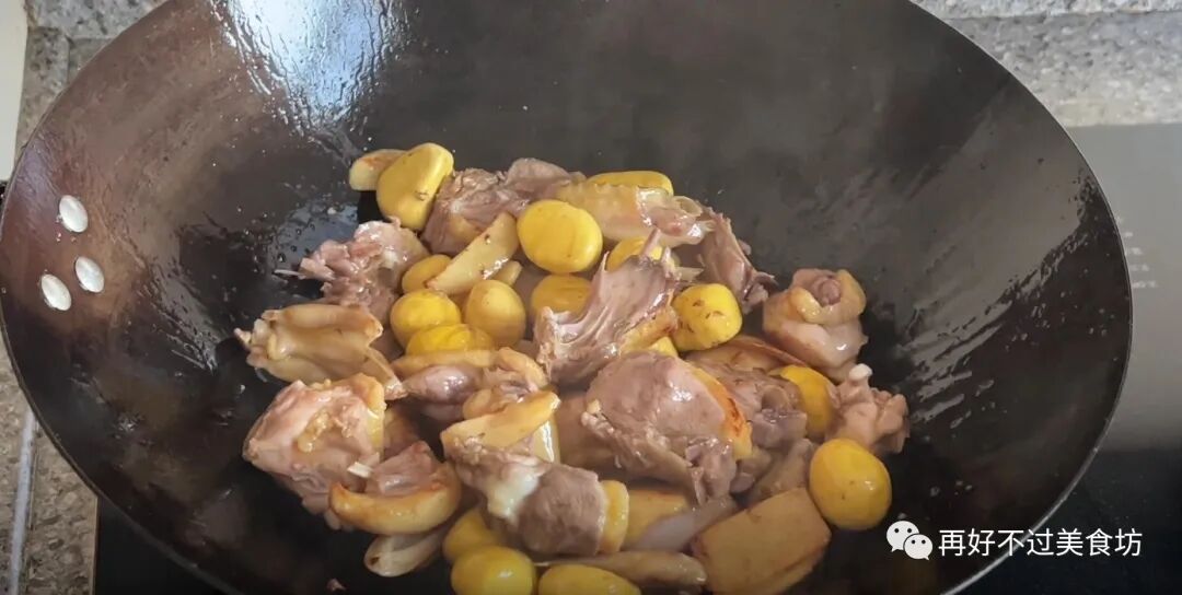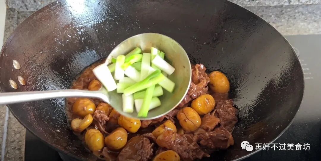 6、等20分钟的时间一到,就直接转成大火,把汤汁收浓,再淋上一点薄芡收汁,继续给它翻炒均匀,汤汁收浓后,再加入葱段,翻炒几下就可以出锅了。