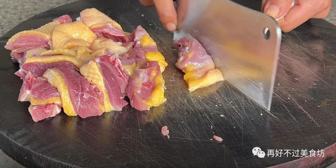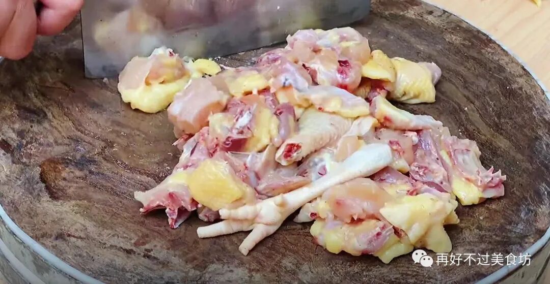 3、先用刀把老母鸡里面的鸡油给切下来,再把鸡屁股给割掉,然后将它给斩成小块,全部剁好后给它放入碗中备用。