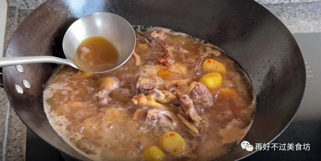 5、全部炒香之后,加入适量的开水,调味就放点盐,白糖,胡椒粉,再加点生抽,蚝油,老抽,盖上锅盖,转小火焖20分钟,把鸭肉焖软。