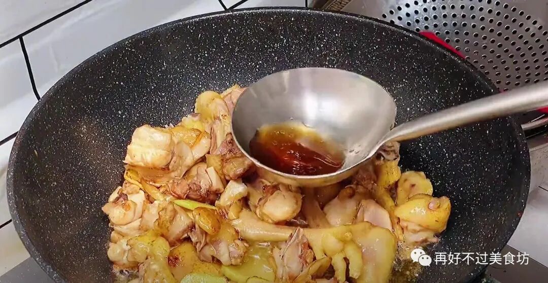 5、接下来放入姜片,再放入剁好的鸡块,开大火,用锅铲给它翻炒,把鸡肉里的水分,给它炒干炒香,炒香后,再从锅边淋入少许料酒去腥,直到把鸡肉炒出油即可。