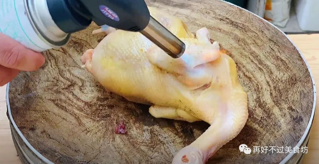 2、准备一只老母鸡,给它清洗干净,再用火枪把上面的绒毛给烧一下,要想炖出来的鸡汤好喝,这些小细节一定要做好。