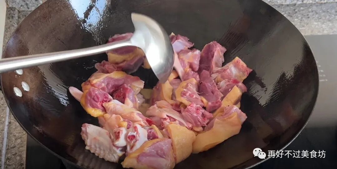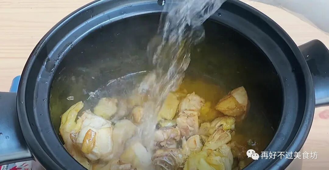 6、等炒出油之后,将鸡肉倒入砂锅中,再倒入适量的开水,让清水没过食材,盖上盖子,转小火给它炖上一小时。