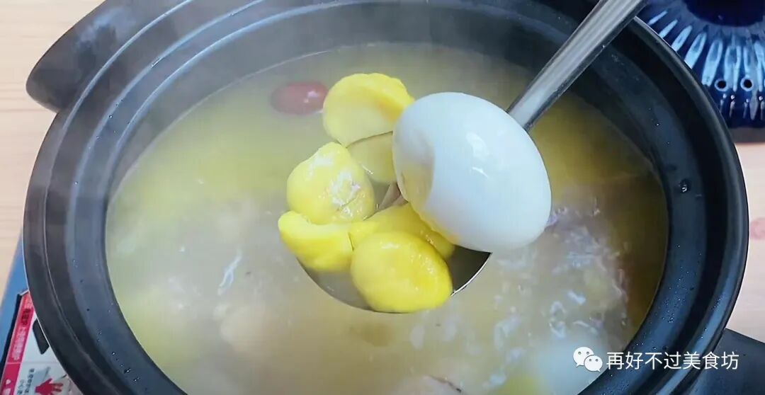 7、时间一到,打开锅盖放入板栗,再下新鲜的土鸡蛋,来点盐调味,盖上盖子,再给它炖上10分钟,最后再放入几颗红枣。