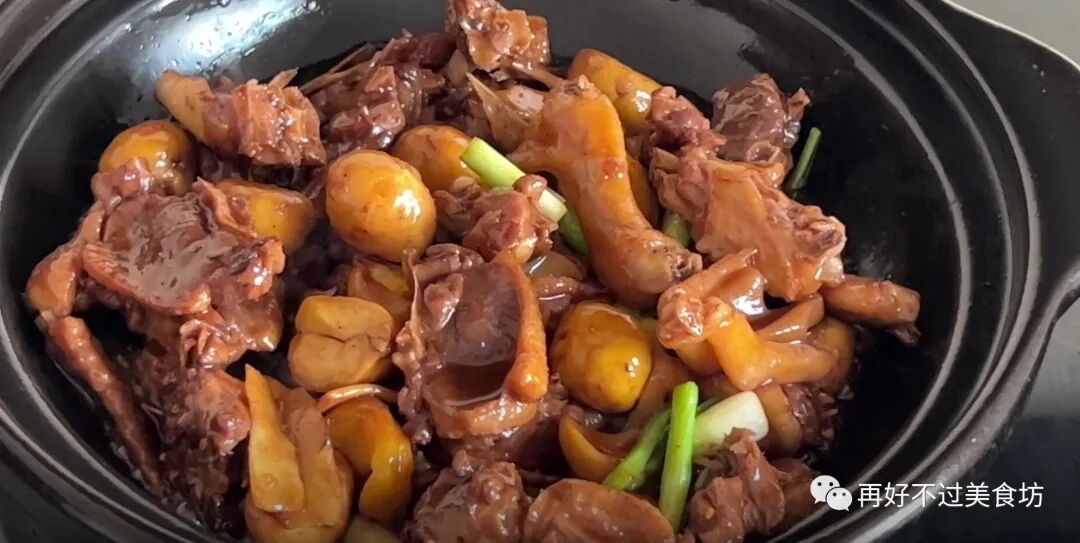 7、砂锅烧热,加点葱段垫底,把炒好的鸭肉装到砂锅里面,这样焖出来的鸭肉软嫩入味,板栗比鸭肉还好吃,越吃越香,喜欢的朋友,赶紧收藏起来试试吧。