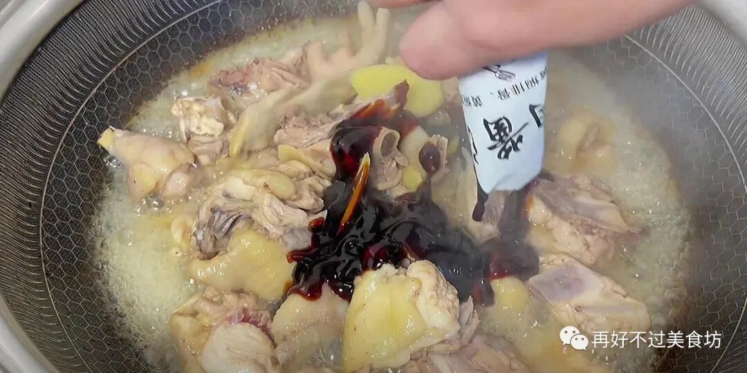 4、等煸炒出油了,再放入一点点料酒,再放入一包黄焖酱汁,用黄焖酱汁来焖这个鸡,是真的挺好吃的,特别是焖土豆,放这样一小包就可以了。